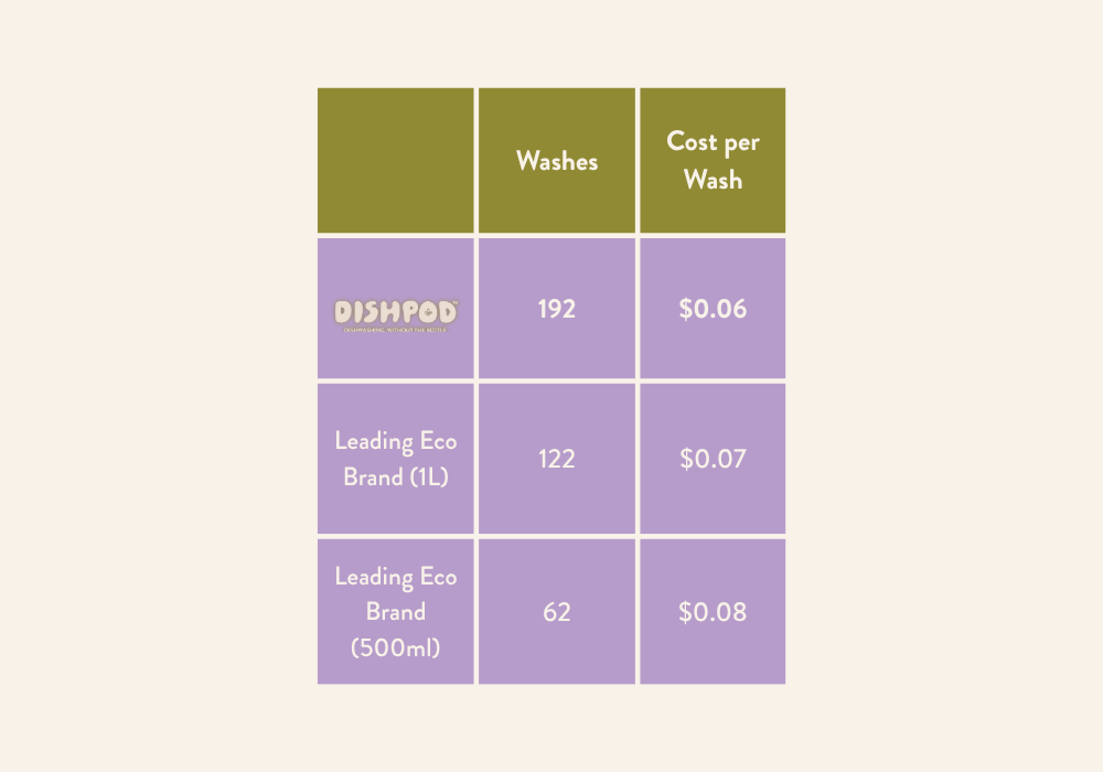 We recommend holding the pod under the tap for 7–10 seconds, depending on your sink size, how dirty the dishes are, and your preference for suds. A 7-second hold gets you up to 192 washes per bar—putting Dishpod right in line with leading eco brands on cost per wash. Even at a 10-second hold, you’re still getting great value—and doing it without the plastic waste.